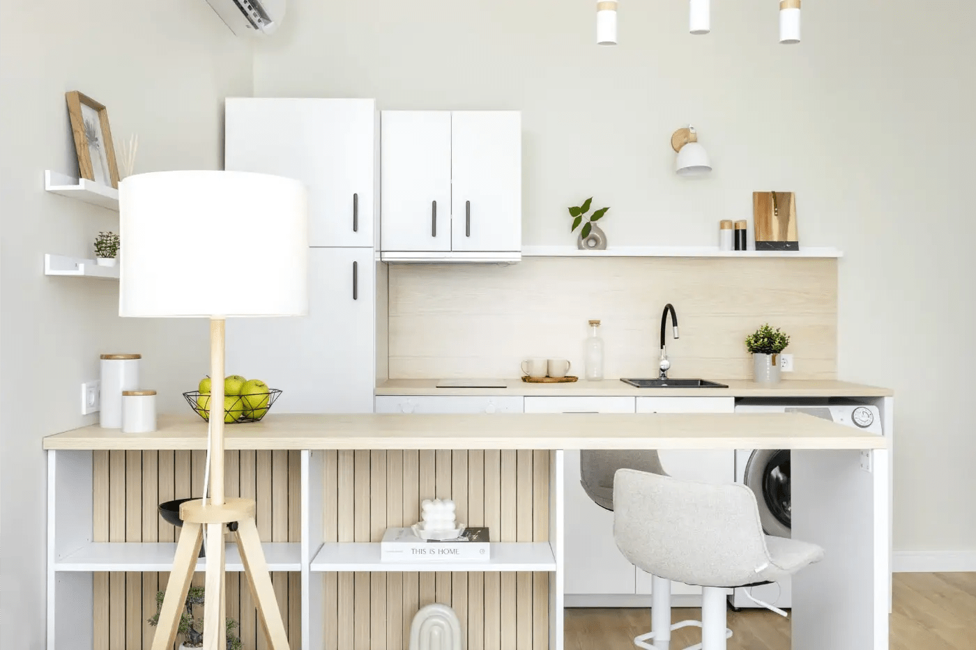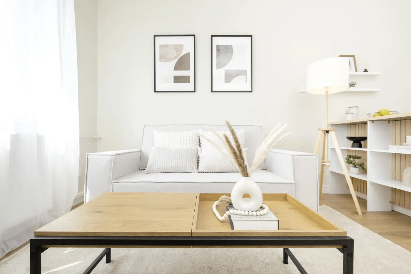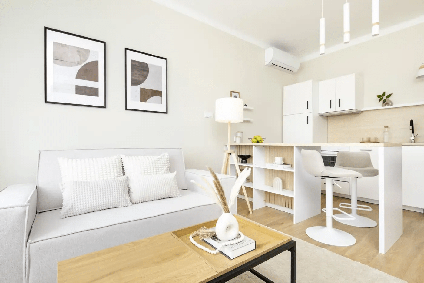 home staging kiadásra felkészítés után nappali és konyha natúr színekkel